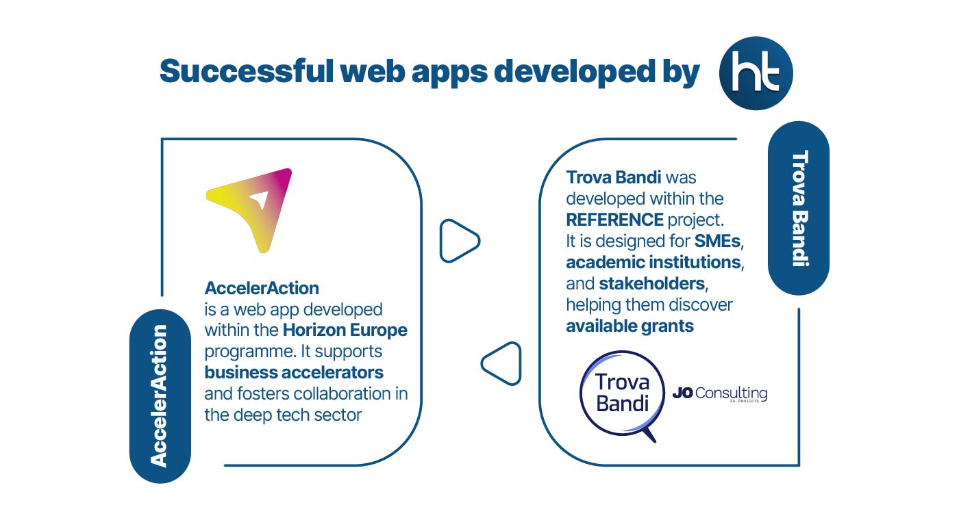As mentioned earlier, HT Apps is proudly a partner in several transnational consortia. We highlight two key examples that led to the development of successful web apps: AccelerAction and Trova Bandi.